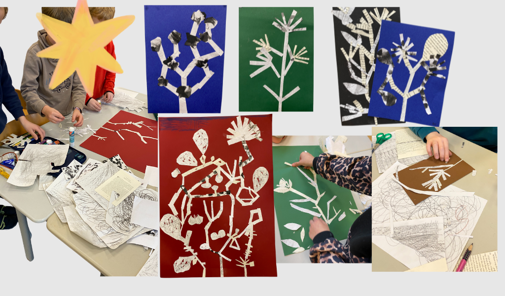 Anschließend wurden die unterschiedlichen Elemente ausgeschnitten, kombiniert und sowohl in Einzelarbeit als auch in kleinen Gruppen zu Collagen zusammengefügt. Dabei konnten die Kinder ihre Ideen einbringen, Materialien ausprobieren und gemeinsam kreative Lösungen finden.