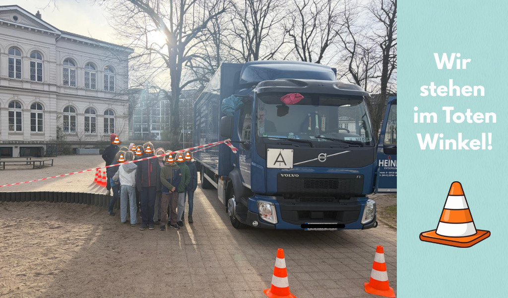 Auf dem Schulhof fand heute eine besondere Aktion zum Thema „Toter Winkel“ statt. Mit Hilfe eines großen Lkw konnten die Kinder selbst erleben, wie schwer sie aus der Fahrerkabine zu sehen sind. Dabei wurde deutlich, wie wichtig es ist, sich im Straßenverkehr vorsichtig und aufmerksam zu verhalten. Die praktische Erfahrung hat allen sehr geholfen, die Gefahren besser zu verstehen.